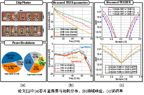 图1展示了单端收发机前端的电路架构图。图2(a),(b),(c)分别展示了提出的发射机芯片显微图与功耗分布、测试的频响结果,及测试的误码率曲线。