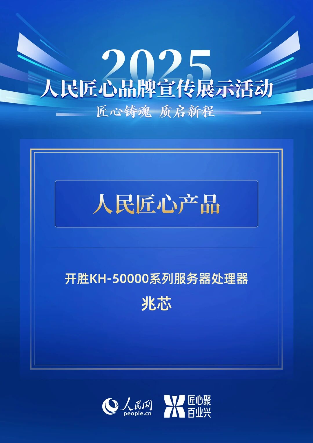 近日,2025人民匠心品牌宣传展示活动案例名单正式公布。本次活动以“匠心铸魂 质启新程”为主题,面向各行业、各领域征集质量过硬、优势突出的产品、技术、服务与品牌,经过多轮审核与遴选,最终形成人民匠心产品等四大类别优秀实践案例。兆芯自主创新研发的开胜KH-50000新一代服务器处理器,凭借全面的技术自主性、卓越的产品创新力及重要的产业应用价值,在众多申报项目中脱颖而出,荣登2025年人民匠心产品。