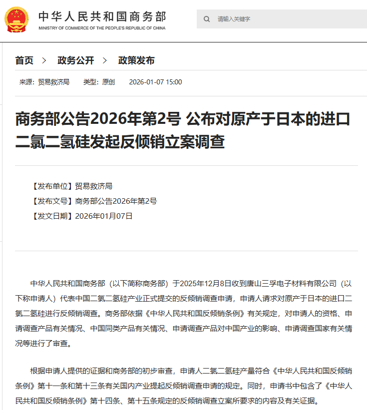 根据上述审查结果,依据《中华人民共和国反倾销条例》第十六条的规定,商务部决定自2026年1月7日起对原产于日本的进口二氯二氢硅进行反倾销立案调查。