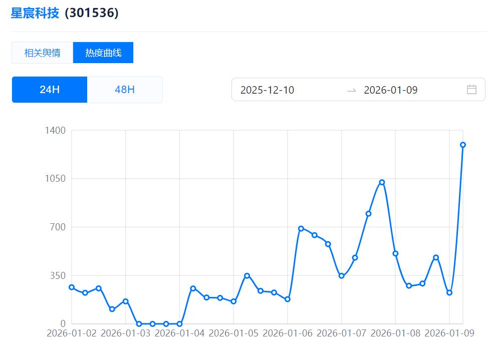维信诺热度上升206名、星宸科技热度上升104名、顺络电子热度上升83名、芯海科技热度上升80名、思特威热度上升72名、大族激光热度上升43名、英集芯热度上升37名、中微公司热度上升28名、英搏尔热度上升22名、江波龙热度上升16名、金力永磁热度上升12名、欣旺达热度上升12名、泰凌微热度上升10名。