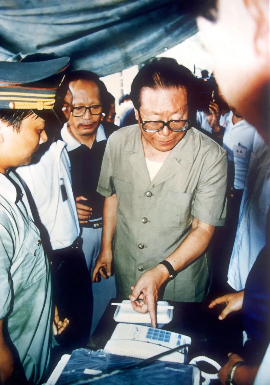 1998年夏天,长江流域大洪水。8月13日至14日,江同志在长江边指挥救灾,现场话机就用了ETS SU-450无线固定台。照片最底部的黑色盒子上依稀可看到LOGO。这张照片后来用在宣传资料上,将LOGO 用计算机PS了一下,使之更清楚,遗憾的是,没能找到当年的宣传材料。