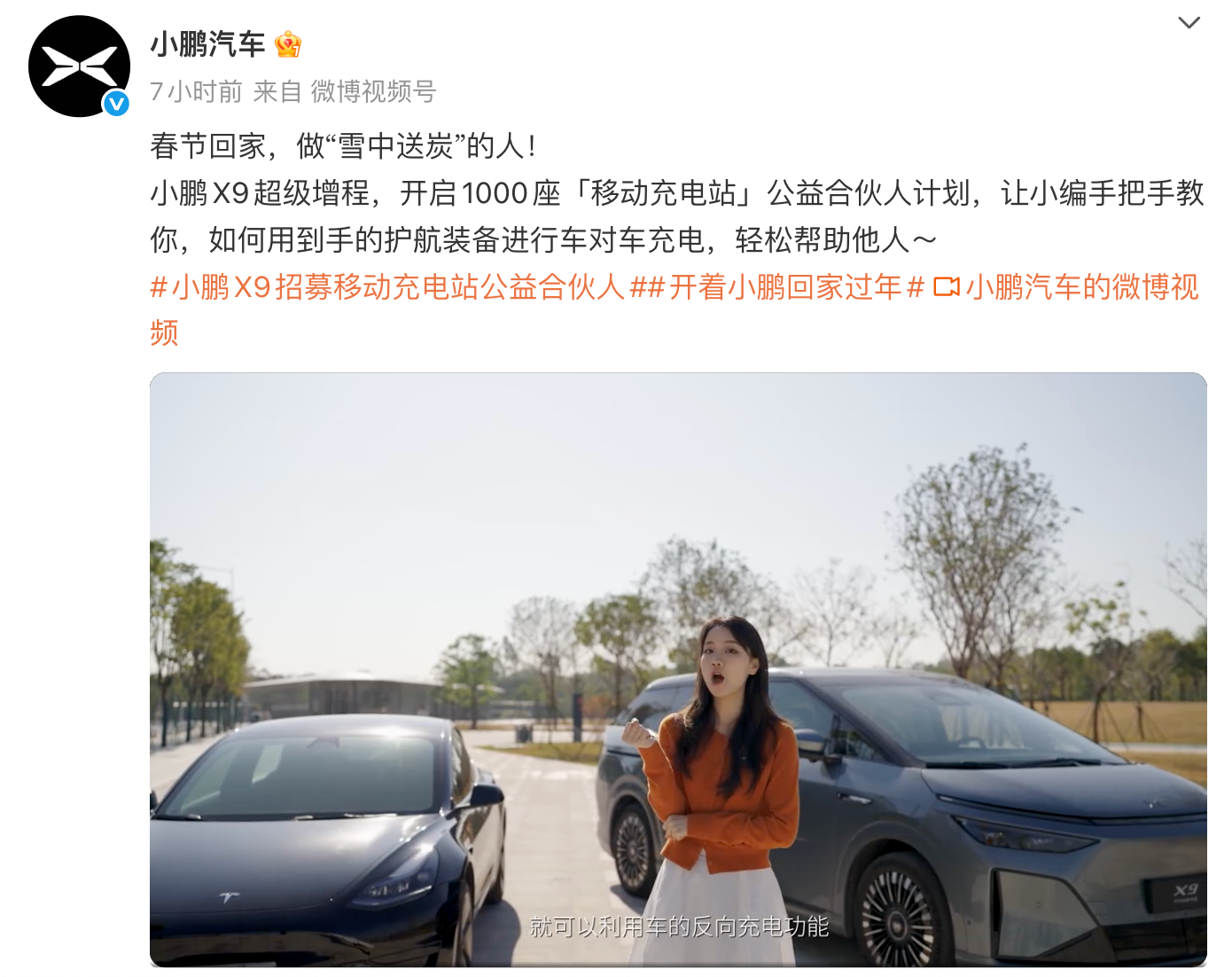 小鹏汽车官方宣布启动1000座”移动充电站“公益合伙人计划。该计划将招募1000名小鹏X9超级增程车主,利用车辆V2V放电能力,为春运途中那些急需充电的新能源车主“保驾护航”。