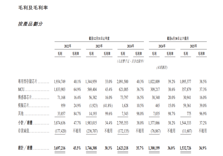 截至2025年上半年末,其营收按产品分类,模拟芯片、专用型存储芯片、MCU的毛利率分别为39.0%、38.5%、37.3%。截至同一时期的公司综合毛利率则为36.9%,截至2025年第三季度末的综合毛利率为38.3%。