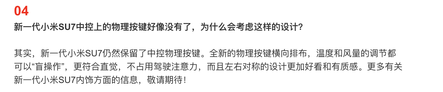 关于新一代小米SU7疑似取消中控物理按键,官方称新一代小米SU7仍然保留了中控物理按键。并且按照横向排布,更符合直觉,不占用驾驶注意力。