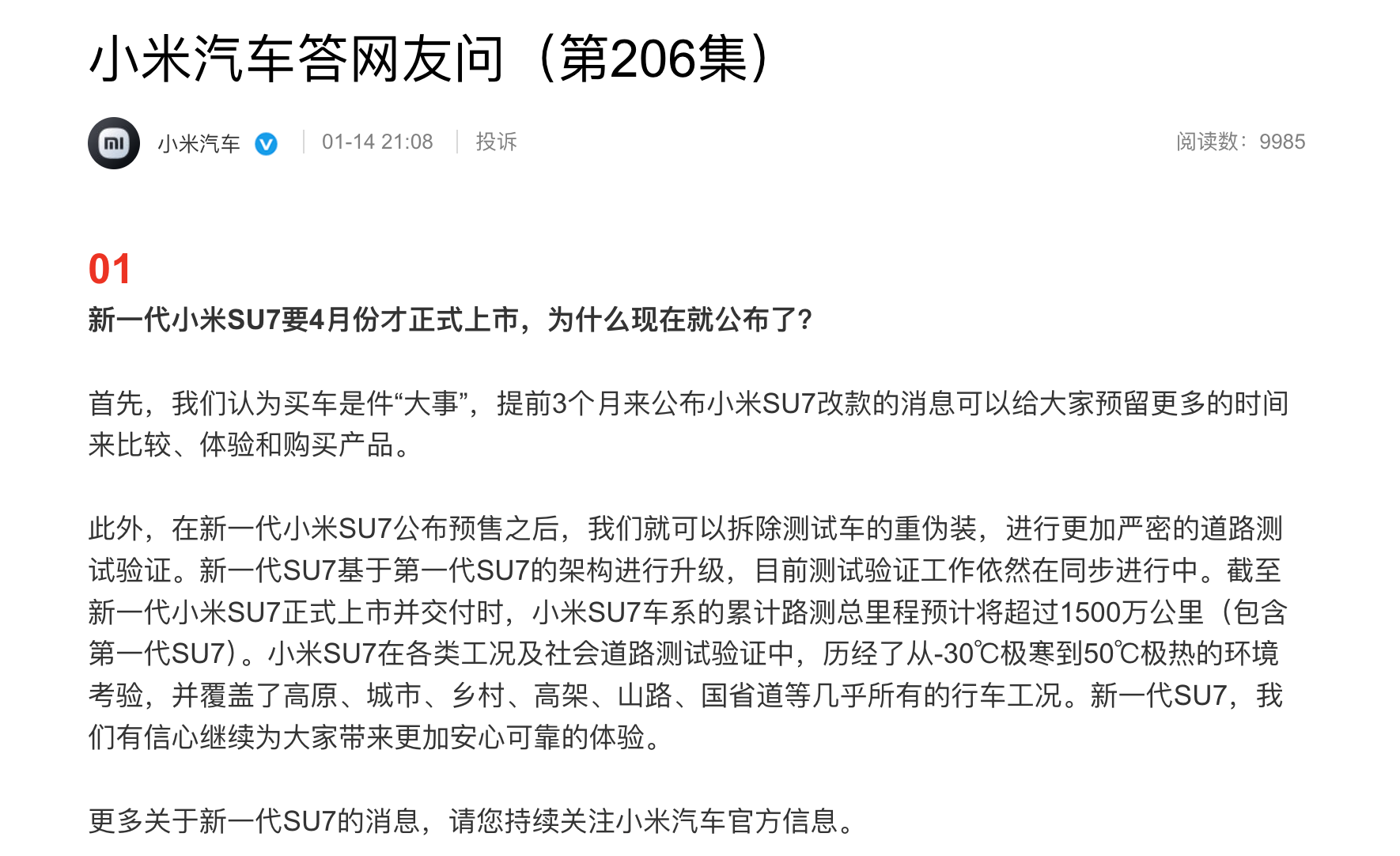 1月14日,小米汽车官方发布答网友问(第206集)。针对“新一代小米SU7要4月份才正式上市,为什么现在就公布了?”的问题,官方称,买车是件“大事”,提前3个月公布小米SU7改款消息可以给大家预留更多的时间来比较、体验和购买产品。此外,在新一代小米SU7公布预售之后,就可以拆除测试车的重伪装,进行更加严密的道路测试验证。