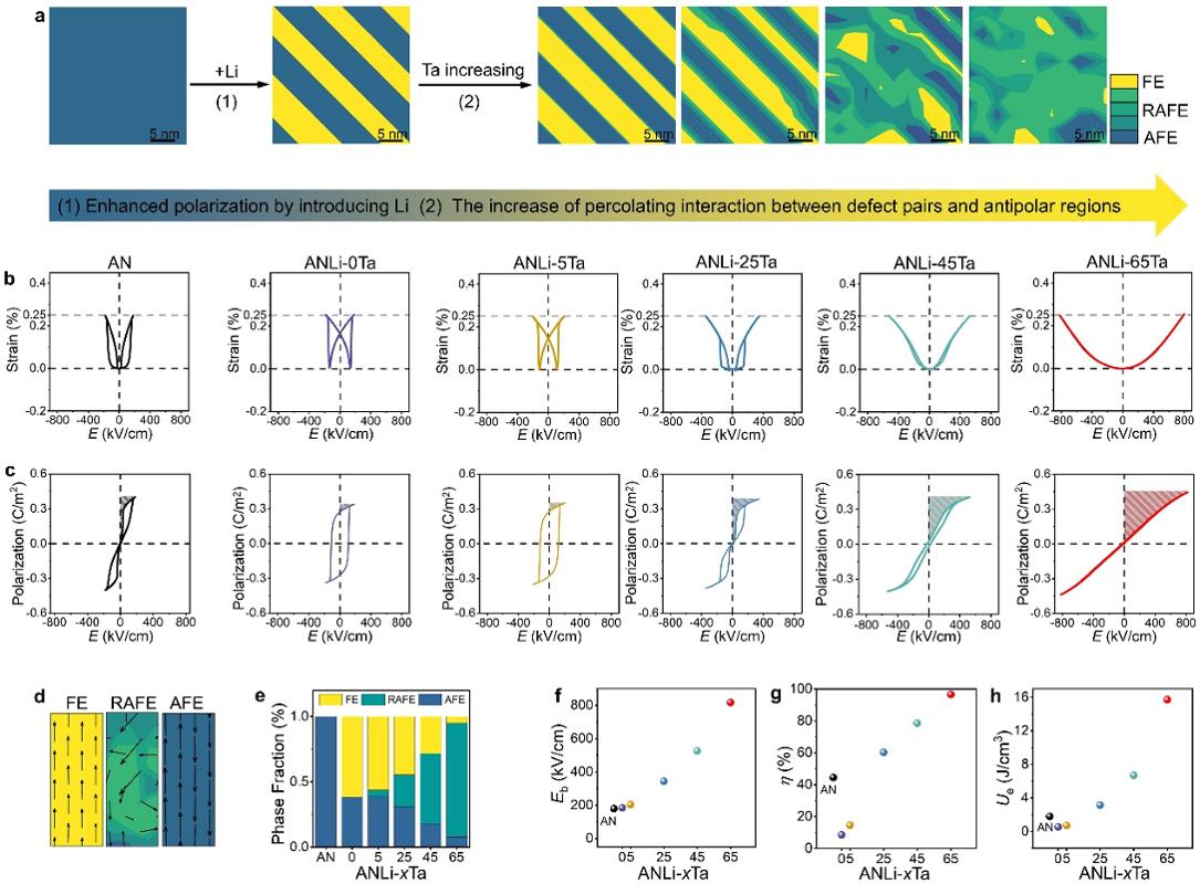 a) 通过增强缺陷对与反极区之间的渗透相互作用设计倾转反铁电态,并展示其中铁电(FE)、倾转反铁电(RAFE)、反铁电(AFE)分布的演变过程;b-c) 计算的应变-电场(S-E)和极化-电场(P-E)回线;d) FE、RAFE和AFE中极化矢量的典型特征图;e)不同ANLi-xTa和AN相分数演变;f-h) ANLi-xTa体系随Ta含量增加的击穿强度(Eb)、储能效率(η)和可恢复储能密度(Ue)变化