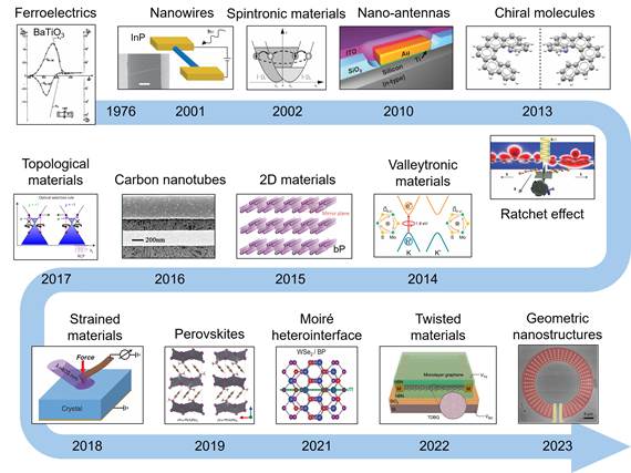 论文首先回顾了偏振光电响应的发展历程(图1)。从早期的一维纳米线体系,到手性分子材料、二维材料、铁电和磁性材料,再到近年来迅速发展的拓扑量子材料与人工微纳超构表面,领域内不断涌现出新的材料体系和响应机制,但不同体系间的物理图像长期缺乏统一认识。