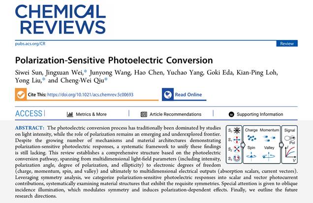 近日,电子科技大学光电科学与工程学院/电子薄膜与集成器件全国重点实验室魏静轩教授、刘永教授团队,联合中国科学院苏州纳米技术与纳米仿生研究所、新加坡国立大学,在国际顶级综述期刊Chemical Reviews上发表题为“Polarization‑Sensitive Photoelectric Conversion”(偏振光电响应)的长篇综述论文。