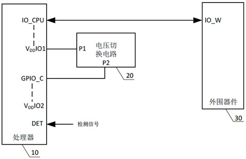 本申请提供一种电压处理电路、方法及计算机可读存储介质,应用于计算机技术领域,该电路包括处理器和电压切换电路,电压切换电路的供电端口经第一电源端口与处理器的通信端口相连,而处理器的通信端口又与外围器件的通信端口相连,为外围器件的通信端口提供工作电压,基于这一连接关系,电压切换电路只要输出与外围器件的端口工作电压匹配的工作电压,不仅可以满足外围器件的端口对于工作电压的要求,同时,还可以确保处理器与外围器件的通信端口之间的工作电压相互匹配,进而满足数据传输要求,因此,本申请以电压切换电路取代现有技术中使用的电平转换芯片,可以有效简化处理器的外围电路的复杂度,有助于降低系统整体成本。