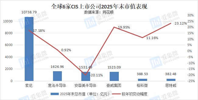 从核心数据来看,索尼以超过万亿人民币的年末市值稳居绝对领先地位,其规模远超其他五家公司,体现了其在消费电子与影像传感领域积累的深厚壁垒。豪威集团、安森美半导体和意法半导体共同构成了千亿市值梯队,而来自科创板的格科微与思特威市值则在380亿至400亿区间,彰显出高成长科技企业的特征。