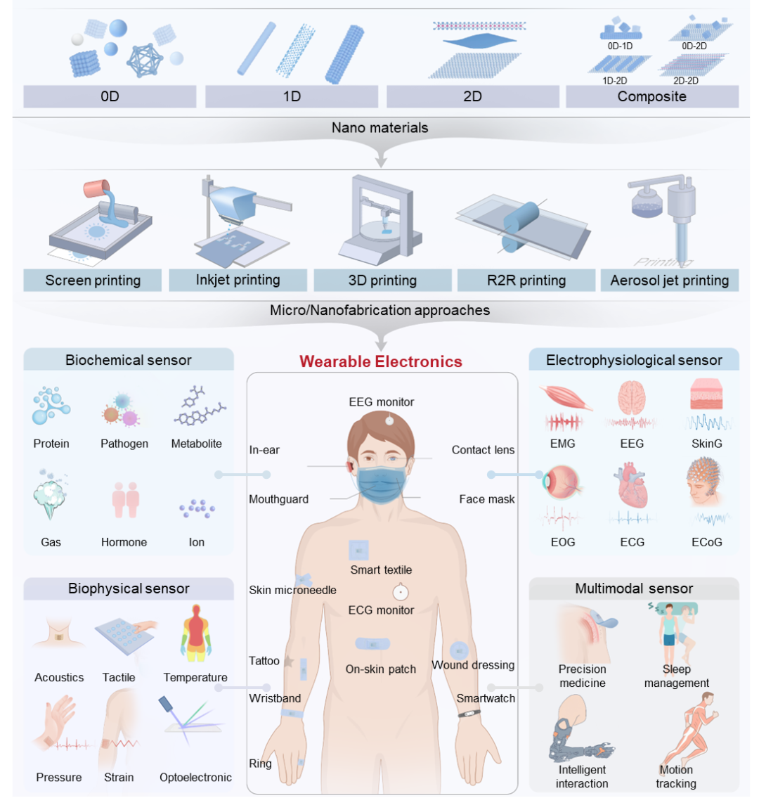 本文聚焦可穿戴电子领域的关键瓶颈,即传统制造技术与柔性化、集成化及多功能化需求之间的结构性不匹配,并以“材料—器件—应用”为主线,构建了微/纳制造技术的系统化评价框架。综述内容覆盖可穿戴电子产品的传统制备路线、有源传感材料及其合成策略与关键特性、人体界面信号的转换机制、系统级核心组件构成,以及多类微/纳制造技术在不同场景中的应用与适配性。文章首先从应用需求出发梳理可穿戴电子的主要场景,进而指出光刻、化学气相沉积(CVD)等传统方法在非常规纳米材料集成与规模化成本控制方面的局限;随后围绕丝网印刷、卷对卷(R2R)、3D 打印、喷墨打印与气溶胶喷射打印五类新兴制造技术,系统解析其工艺原理、关键参数与代表性案例。通过对面向可穿戴电子的新型制造路径及其在生化、生物物理、电生理与多模态传感平台中的实践应用进行深入评估,本文进一步凸显这些创新技术在提升器件性能、优化使用体验与推动工程化落地方面的潜力,并在此基础上提出材料—工艺兼容性、高通量制造能力与长期穿戴舒适性等值得重点关注的未来方向。整体而言,本文既勾勒了当前技术发展图景,也揭示了相关制造范式对可穿戴电子未来演进可能带来的深远影响。