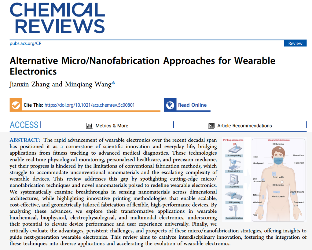 2026年1月13日,上海交通大学溥渊未来技术学院王敏强副教授团队在化学领域顶级综述期刊《Chemical Reviews》发表题为“Alternative Micro/Nanofabrication Approaches for Wearable Electronics”的系统性综述论文,并入选为期刊封面文章。该成果系统梳理了可穿戴电子领域微/纳制造技术的最新进展,为下一代柔性可穿戴器件的规模化生产与临床转化提供关键指导。