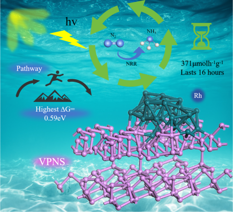 针对以上问题,西安交通大学电气工程学院、电工材料电气绝缘全国重点实验室张锦英课题组发现紫磷纳米片在1.0wt%铑助催化剂且无需牺牲剂的条件下,在一次性连续工作16小时的情况下其固氮速度达到371µmol g h,且循环8次其波动性在10%以内,其固氮速率高于目前报道的绝大多数光催化剂,其连续工作稳定性高于报道的光催化剂。结合原位漫反射红外傅里叶变换和密度泛函理论计算等方法,发现氮气易吸附于助催化剂铑(靠近VP表面)处,并逐步被还原成*NH-NH, *NH-NH2, and *NH2-NH2,而后转化为氨,能垒最高的第一步(*N-N →*N-NH)还原为吸热反应(0.6eV)。同时发现活性点铑在无空位的紫磷上的氨脱附为放热反应,而如果是在紫磷空位附近则脱附能垒极高会造成其循环性能变差。