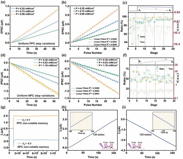高线性权重更新:电导-脉冲数线性度R²>0.99,优于现有二维/有机/氧化物体系。128态非易失存储:连续光脉冲下可分辨128级权重,对应7 bit精度,保持时间>1000 s。