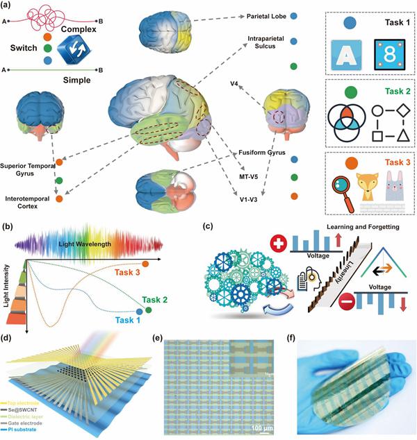 图1. 受脑功能区启发的晶圆级突触阵列的设计和制造