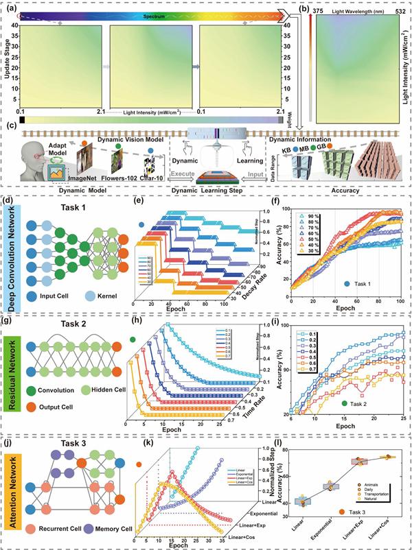 中国科学院苏州纳米所康黎星团队提出了一种通过化学气相输运制备的硒内嵌单壁碳纳米管(Se@SWCNTs)的一维范德华异质结。利用像差校正透射电子显微镜 (AC-STEM) 以及光谱学和电学表征,成功证实了双链硒被封装在单壁碳纳米管内部。与先前研究不同,通过溶液沉积技术成功制备了大面积的半导体性 Se@SWCNTs 薄膜。利用这些薄膜,在柔性基底上构建了4英寸晶圆级的 Se@SWCNTs 一维范德瓦尔斯异质结光电晶体管。这种方法消除了对多层异质结或复杂电路的需求,从而简化了阵列集成和晶圆级制造。结合有效的栅极调制,实现了对 PPC 和NPC 响应的高度线性和精确控制。其线性拟合相关系数 (R2) 超过 0.99。 同时实现了具有超过128个存储态的线性 PPC 和 NPC。通过利用器件在不同光强度(0.1–2.1 mW/c㎡)和波长范围下的性能变化,我们展示了在受脑区功能启发的、复杂度递增的三项任务中,权重规则处理的高度一致性。重要的是,这三项不同视觉任务(数字/字母识别、形状识别和特征识别)所需的神经结构(深度卷积网络、残差网络和注意力网络)及其对应的衰减率(阶梯式、指数式和预热式)也是不同的。所提出的晶体管能够通过光学混合编程促进受生物启发的脑区之间的转换,从而适应动态的视觉环境。这种首次引入的创新方法,为脑启发计算和仿生视觉的实际应用铺平了道路。