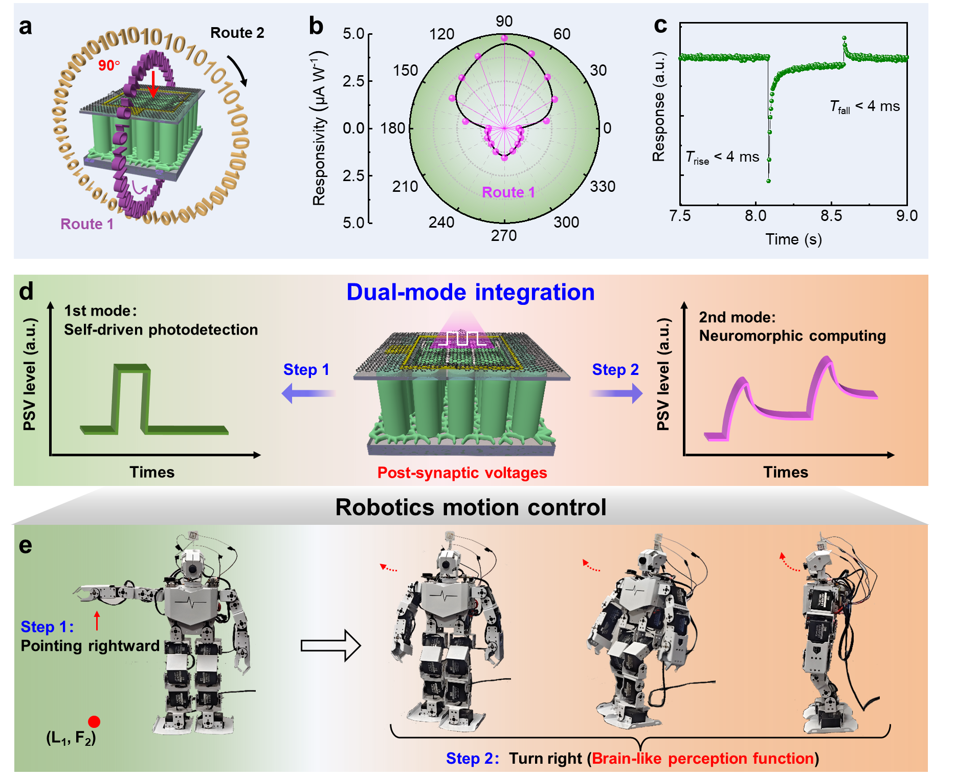 图2. (a-c)全向探测模式示意图与实验测试数据,(d)探测突触双模单片集成示意图,(e)机器人智能感知应用验证