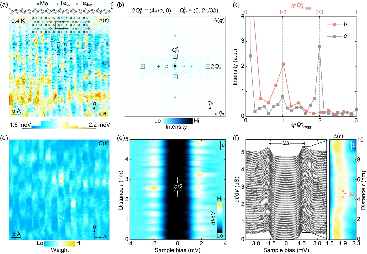 在前期欠掺杂单层1T′-MoTe2中观察到共存五倍单轴电荷密度波与配对密度波的基础上(Phys. Rev. B 112,L060503 (2025)),中国科学院苏州纳米所纳米真空互联实验站李坊森研究员等与清华大学物理系宋灿立、马旭村、薛其坤研究团队及波士顿学院汪自强研究组合作,基于真空互联的极低温扫描隧道显微镜和分子束外延等设备,在单层1T′-MoTe2超导薄膜首次直接观测到亚晶格内库珀对密度波(PDW)与电荷密度波(CDW)的竞争-耦合共存现象。研究团队在高质量原位外延生长单层1T′-MoTe2薄膜的基础上,利用极低温扫描隧道显微镜/隧道谱成像,清晰地观察到超导能隙大小、相干峰强度及能隙内态密度的周期性空间调制(如下图所示)。