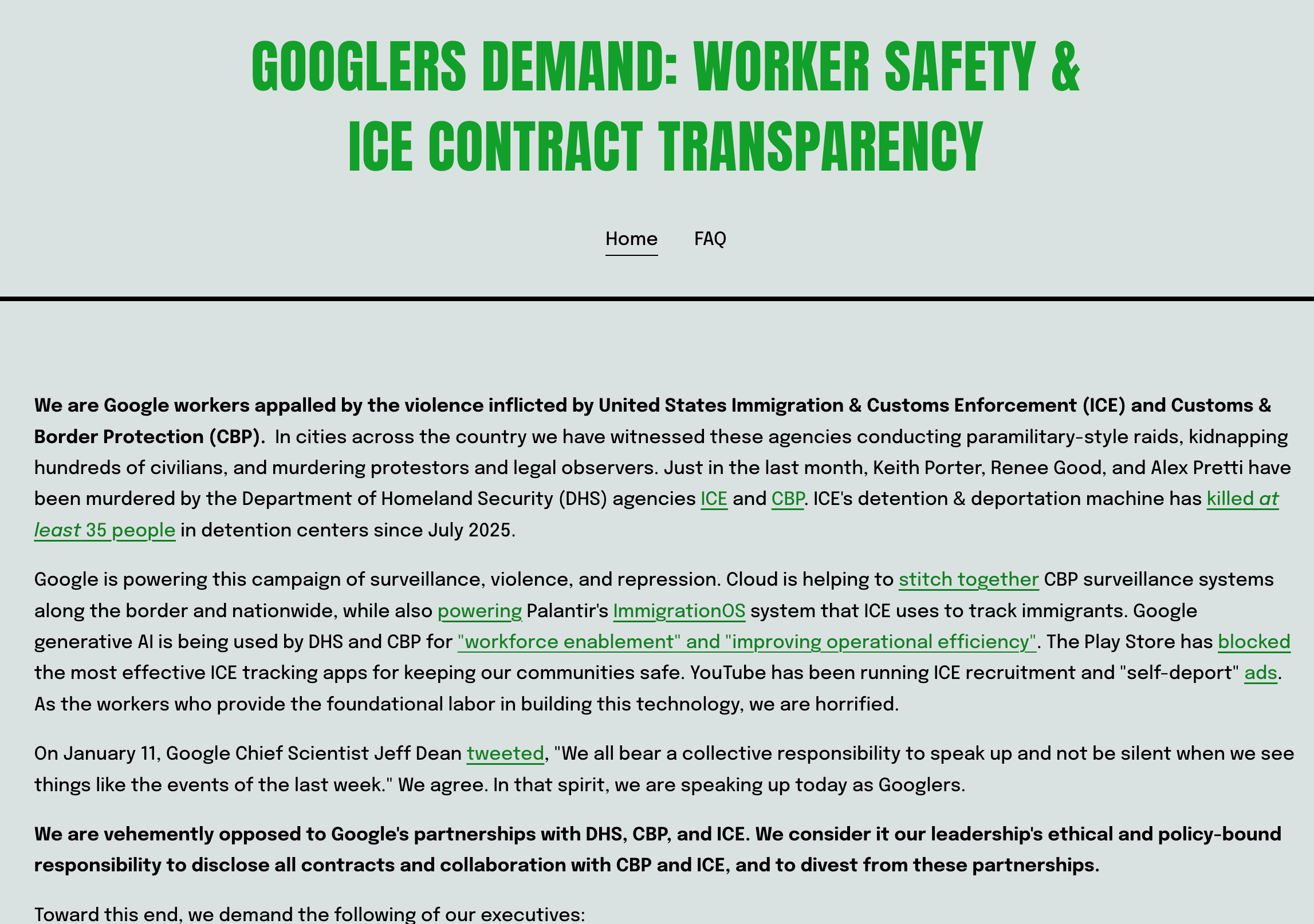签署请愿书的谷歌员工横跨16个产品领域,其中约30%来自谷歌云。他们声称,谷歌的技术正在被用于助长“国家暴力与压迫”。请愿书指出,谷歌云被用于边境监控,同时生成式AI提高了ICE和CBP的“运作效率”,而这些机构正是近期导致平民死亡和人道主义危机的责任方。