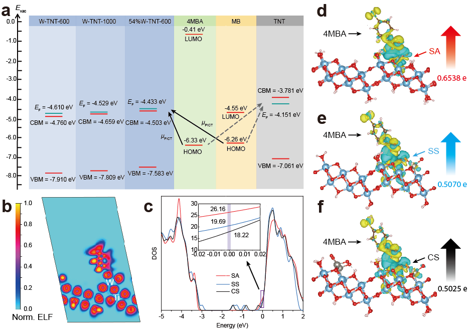 图2. 单原子基底上 SERS 增强的机理研究。(a) TNT、W-TNT-600、W-TNT-1000和54%W-TNT-600相对于MB和4MBA探针分子的能级图;(b) 4MBA-SA系统的ELF图;(c) SA、SS和CS的态密度。4MBA在 (d) SA、(e)SS和(f) CS上的差分电荷和电荷转移量,其中蓝色区域表示电荷损失,黄色区域表示电荷聚集。