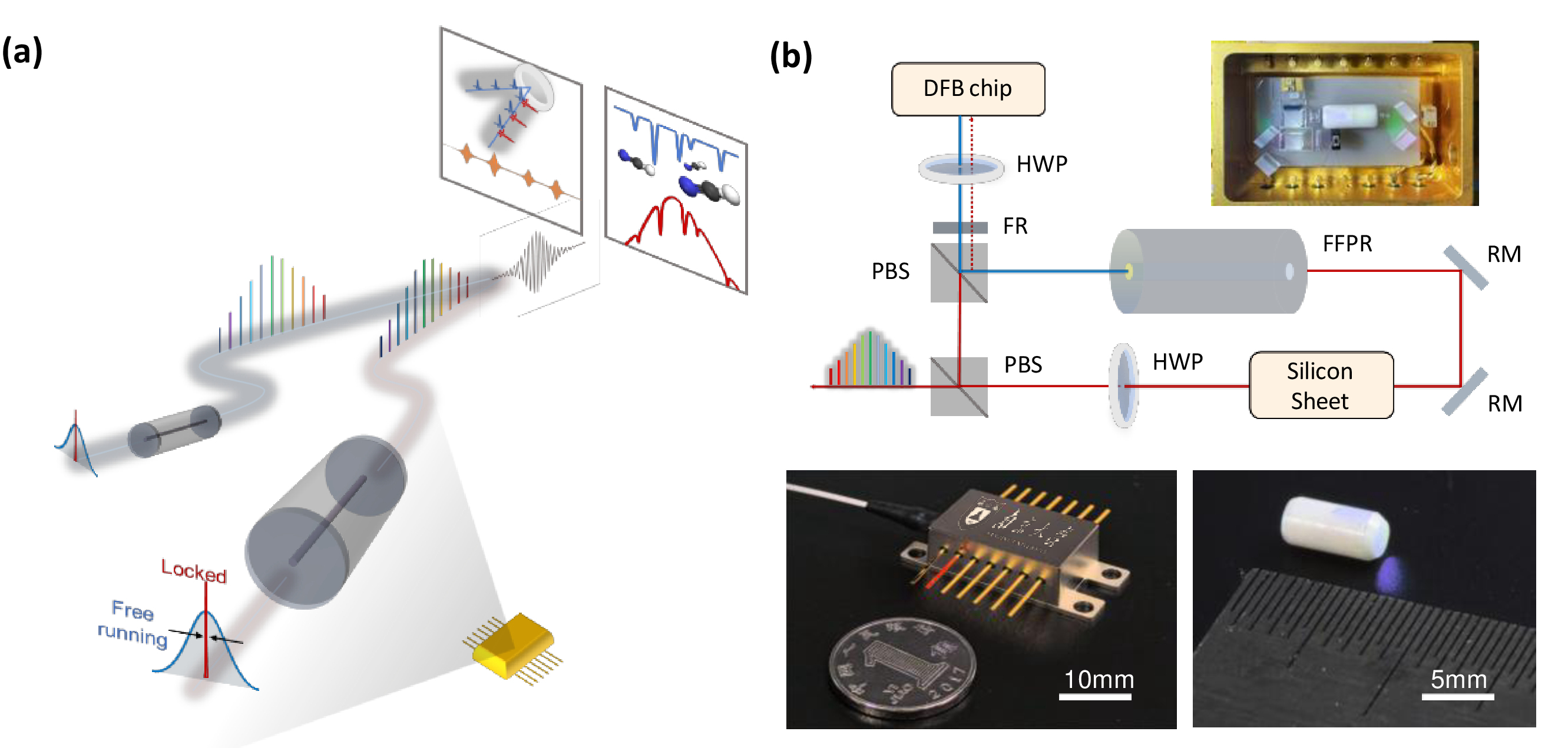 图. 紧凑型低噪声微腔光频梳器件架构及其双光梳应用。(a)用于高精度测量的低噪声双微腔光频梳系统概览。两个独立器件分别产生探测光梳和参考光梳,通过高度相干的双光梳外差技术实现精密测距与光谱测量。光纤法布里-珀罗谐振腔(FFPR)既作为自注入锁定所需的高Q值谐振腔,又是产生克尔光学频率梳的主要介质。(b)分布式反馈激光器(DFB)输出的光进入高Q值FFPR后,通过自注入锁定,DFB激光器可被稳定并锁定在谐振频率上,从而产生克尔光频梳。插图为内部设计示意图,左下角图片展示了采用蝶形封装的紧凑型FFPR器件,整体尺寸为20毫米×12毫米×9毫米,其中FFPR长度为0.5厘米(右下角),其两端镀有反射率大于99.99%的布拉格反射镜。