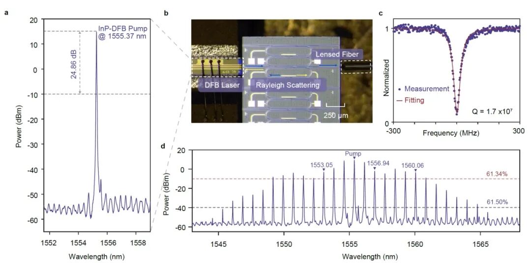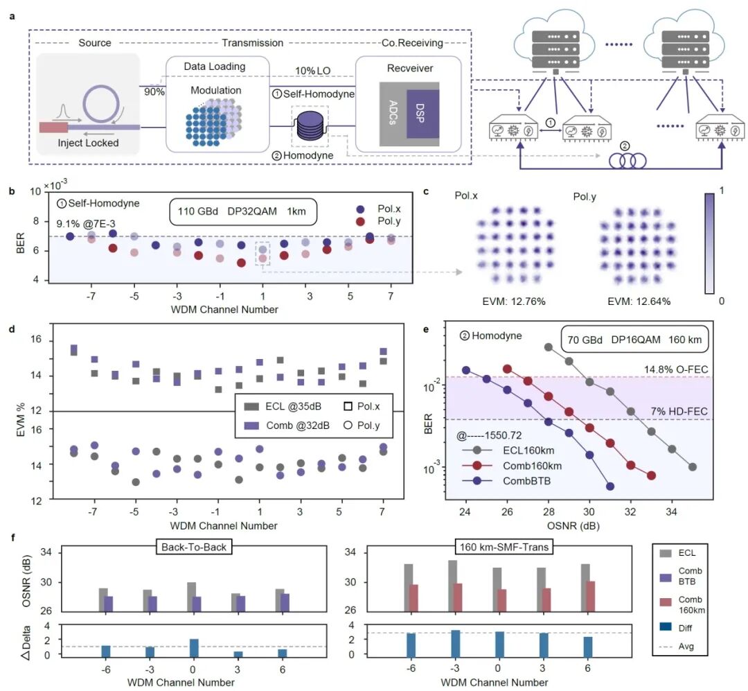 本研究主要验证了微腔光梳在标准通信场景下的性能。实验利用自注入锁定(SIL)微光梳中间功率最高的16根梳齿作为载波,分别进行了两种传输测试。首先是在1公里短距离的“自零差”系统中,单通道实现了110 Gbaud DP-32QAM的超高速率,单波长净速率突破1 Tbps 。其次是更接近实际城域网应用的160公里长距离“零差”传输,采用70 Gbaud DP-16QAM调制,实现了约8.96 Tbps的总容量。对比实验结果表明,相比于线宽约10 kHz的高性能商用外腔激光器(ECL),该微光梳由于具有极窄的线宽(<600 Hz),在长距离传输后表现出更低的误码率和更小的光信噪比(OSNR)代价,证明了其在对抗光纤非线性效应和相位噪声方面的优势 。