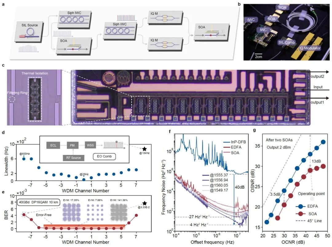 为了满足边缘计算“轻量化”需求而构建的微型化系统。实验去除了传统实验中体积庞大的波长选择开关(WSS)和掺铒光纤放大器(EDFA),替换为集成的硅光波形整形芯片(IWC)和半导体光放大器(SOA)。虽然集成的SOA和IWC相比台式设备引入了更高的插损和噪声(特别是SOA的ASE噪声),但得益于SIL微光梳本身极高的相干性和信噪比,系统仍能“扛住”这些恶化。最终,该芯片级系统在10公里传输中成功实现了5.12 Tbps的聚合速率(40 Gbaud DP-16QAM),并将系统物理尺寸缩小了约一百倍,验证了其在紧凑型边缘设备中部署的可行性。