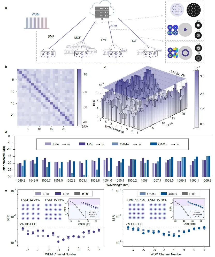 本研究通过增加空间维度来极大提升传输容量,模拟分布式边缘节点的流量聚合。实验核心是利用一根2公里的24芯多芯光纤(MCF),配合16个波长的微光梳信号,实现了高达215.04 Tbps(净速率约200 Tbps)的总传输速率,这是目前基于片上光源在C波段实现的最高记录。此外,实验还展示了模分复用(MDM)的能力,分别在25公里的少模光纤(FMF)中传输LP模态,以及在50米的环形芯光纤(RCF)中传输轨道角动量(OAM)模态。这证明了该微光梳光源能够兼容各种特种光纤技术,通过“波长+空间+模态”的多维复用,在不增加波长资源的情况下大幅扩展系统容量。