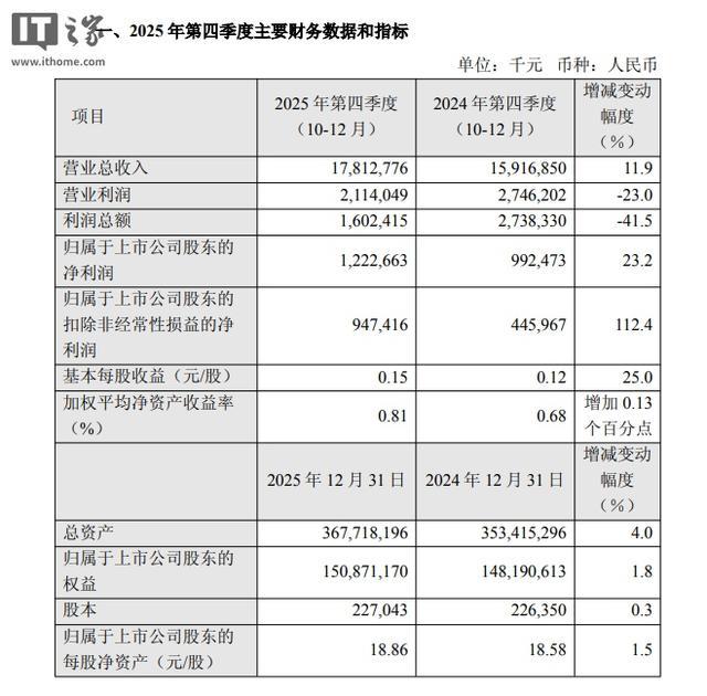 2025 年第四季度报告期内,公司实现营业收入 178.13 亿元,较上年同期增长 11.9%;营业利润 21.14 亿元,同比下滑 23.0%;归母净利润 12.23 亿元,同比增长 23.2%;毛利为 30.96 亿元,毛利率为 17.4%。