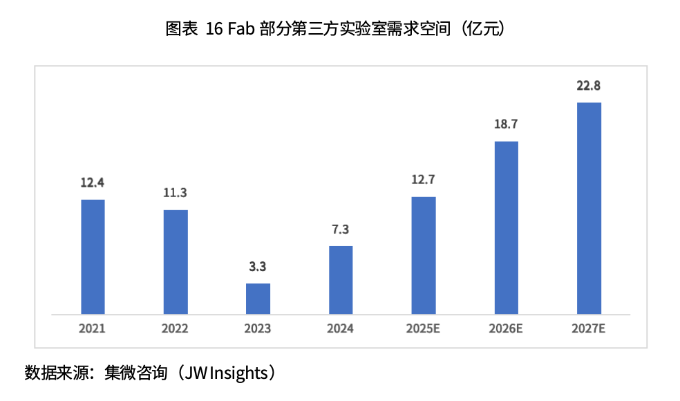 根据集微咨询测算,新增1万片/月产能对应的来自晶圆代工企业的第三方实验室服务市场空间增量约为1000-1500万元,因此2025年该部分市场增量约在12.7亿元左右,且随着已规划产能的逐步释放,预计2026年和2027年该部分市场空间将达到18.7亿元和22.8亿元。
