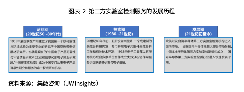 中国大陆半导体第三方实验室服务的发展历程主要可以划分为3个阶段。20世纪50-80年代,1955年底中国亚热带电器器材研究所在广州成立,即现在的赛宝实验室;20世纪80年代初,五所成立中国第一个成建制的失效分析实验室,专门开展电子元器件失效分析工作和相关技术开发;21世纪初开始,欧美、中国台湾地区等第三方检测机构进入中国大陆市场,并占据中国半导体检测大部分市场份额,中国本土民营第三方检测机构也开始诞生发展,本土半导体第三方实验室服务机构成立,国内半导体第三方实验室服务行业进入快速发展时期。