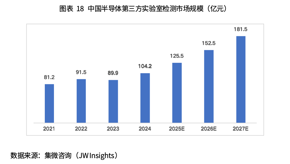 随着人工智能(AI)、5G等关键技术持续落地的推动下,半导体产业需求快速增长,国内半导体第三方实验室检测服务市场也迎来强劲扩张,市场前景广阔。集微咨询预计,2025年中国半导体第三方实验室检测服务市场规模将达到约125.5亿元,至2027年有望进一步增至181.5亿元。