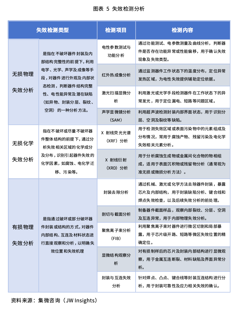 第三方实验室检测服务主要包括功能测试和物理验证等,这部分通常由第三方实验室为芯片设计企业和晶圆代工企业提供服务,主要涵盖可靠性分析(RA)、失效分析(FA)、材料分析(MA)、信号测试、芯片线路修改等,其中比较重要的包括可靠性分析、失效分析、材料分析等。相较于晶圆测试、成品测试等后道检测,可靠性分析、失效分析以及材料分析等实验室检测则贯穿半导体全产业链,检测对象包括产业链任一环节、量产前或量产后的样品,帮助企业加快研发进度、改进生产工艺。