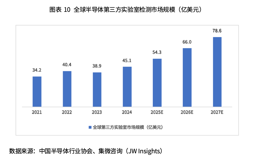 检测分析行业为各产业升级发展提供支撑性服务,与下游细分行业融合发展,新兴领域检测市场受益于新兴领域自身的高速发展,在整体检测检验市场中的收入占比逐渐提升。根据集微咨询测算,2025年全球第三方实验室检测服务市场规模为54.3亿美元,预计2027年市场有望达到78.6亿美元。