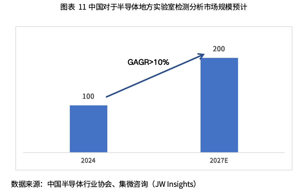 同时半导体产业国产化必然经历反复研制与试验的过程,推动半导体检测需求增长。再国产化趋势背景下,我国半导体产业链不断完善,国内已陆续涌现一大批优秀的芯片设计、芯片制造及封测厂商,也为国内半导体第三方检测分析市场提供了发展契机。根据中国半导体协会数据,预计到2024年,我国半导体第三方实验室服务分析市场规模将超过100亿元,2027年行业市场空间有望达到180-200亿元,年复合增长率将超过10%。