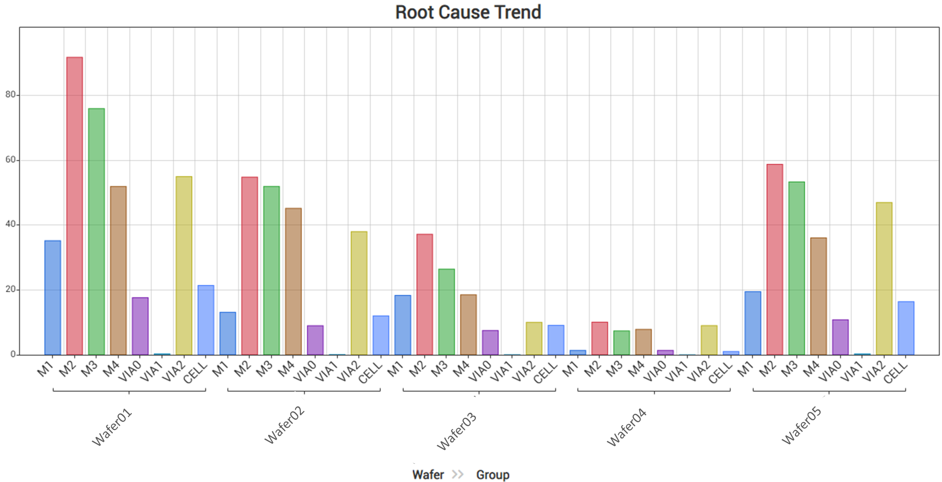 YAD通过数据挖掘和良率相关分析,融合先进AI算法模型,提供多种算法实现更准确的根因诊断分析(RCA, Root Cause Analysis)。此外,YAD可自动对Root Cause进行分组,通过RCA Trend看板展示每片Wafer的缺陷在物理层上的分布趋势,定位是否为已知问题。
