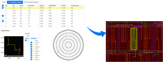 YAD支持通过常规RCA分析、AI-RCA分析快速定位可能的失效根因,系统支持显示PFA路径,自动推荐最佳物理失效分析(PFA)候选者,显著提高PFA命中率,减少人工挑选的时间和成本。借助内置的广立微LayoutVision版图可视化工具,可全局显示缺陷的布局信息,并通过直观的图形化界面进一步追踪失效路径及分析其影响。