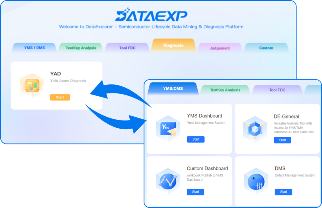 此外,结合广立微DataEXP大数据平台,YAD可与YMS深度集成,串联芯片CP数据、Inline Metrology、WAT、Defect数据,形成芯片设计诊断到量产良率提升的闭环,实现多维度数据下钻分析。
