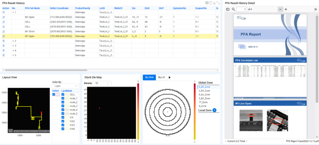 PFA History功能可智能关联Smart PFA Candidate,方便用户快速回传PFA报告,正确记录芯片失效原因及位置,并对历史PFA详情进行长期的趋势分析。