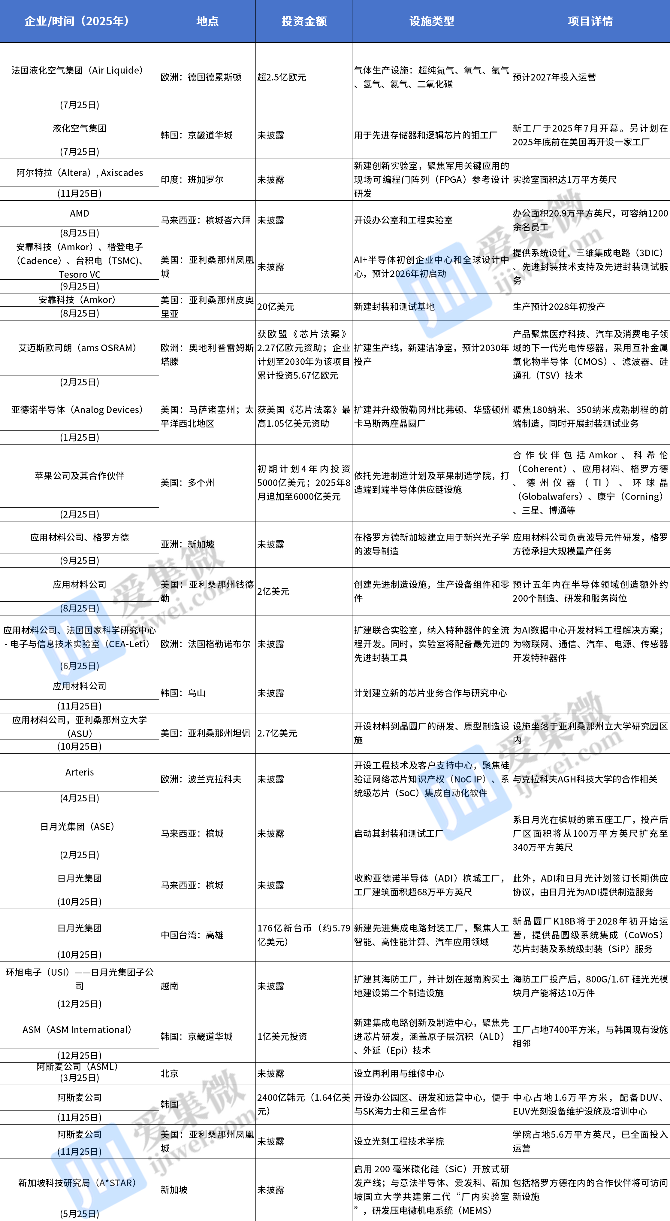 以下是2025年全球官宣的新设施/晶圆厂投资与升级项目,按企业/机构名称首字母排序: