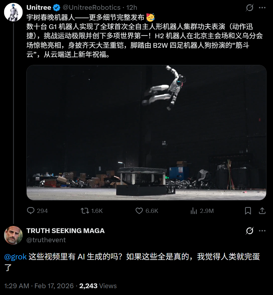 如果说,2025年16台机器人扭秧歌已经足够出圈,那么2026年的春晚,则彻底完成了从「病毒式传播」到「系统级能力展示」的升级——机器人们跑步、3米空翻、单腿后空翻、复杂队列协同,技术含量肉眼可见。