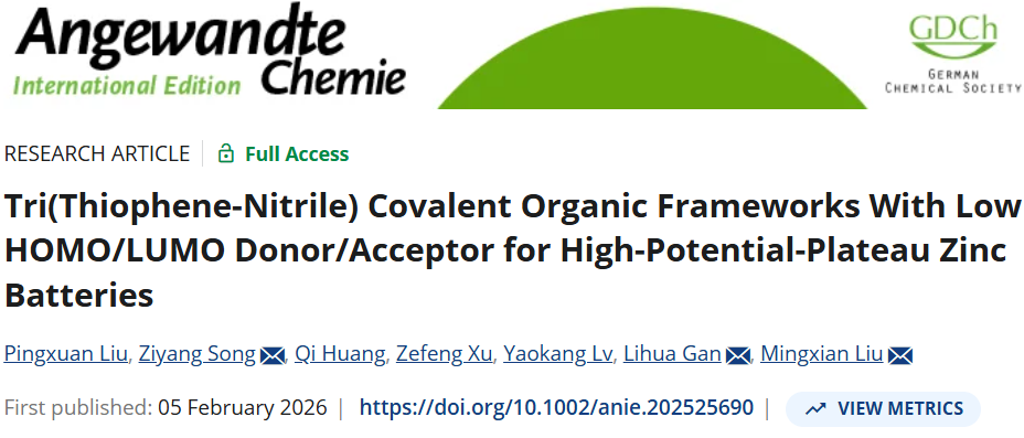 同济大学化学科学与工程学院甘礼华教授、刘明贤教授团队长期致力于高效储能材料研究并应用于新能源电池,课题组近期设计了低HOMO/LUMO给体-受体的三噻吩-三氰基COFs正极材料,促进了低反应能垒的CF3SO3−/NH4+相反离子交替配位,揭示了p型三噻吩和n型三氰基单元的协同氧化还原电荷存储机制,有效解决了当前COFs高比容量和电压平台难以兼顾的难题,构建了高能量密度和长循环寿命的锌-有机电池。相关研究成果以“Tri(Thiophene-Nitrile)Covalent Organic Frameworks With Low HOMO/LUMO Donor/Acceptor for High-Potential-Plateau Zinc Batteries”为题发表于化学领域国际权威期刊《德国应用化学》(Angewandte Chemie International Edition)。