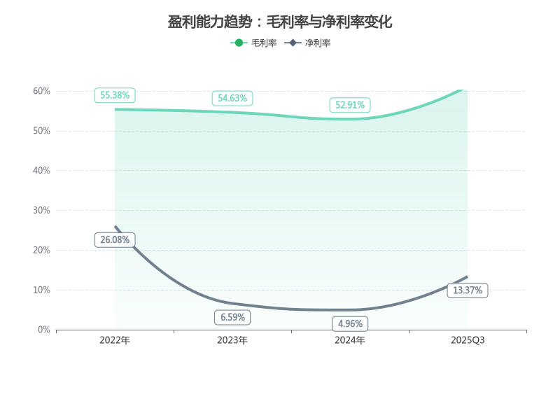 2025Q3公司盈利质量显著改善,毛利率达61.23%,较2024年提升8.32个百分点;净利率达13.37%,较2024年提升8.41个百分点,且毛利率、净利率均显著高于行业均值(行业毛利率55%、净利率8%)。