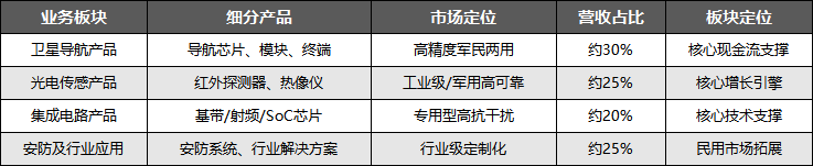 各业务板块实现技术复用与客户资源共享,例如卫星导航领域的高精度定位技术可延伸至光电传感的安防监控场景,军工客户资源也为民用产品的品牌背书提供支撑。