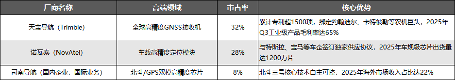 全球高端高精度定位市场呈现寡头垄断特征,天宝导航、诺瓦泰占据核心份额,国内厂商仅司南导航实现少量海外突破,振芯科技目前仍以国内市场为主,具体格局如下: