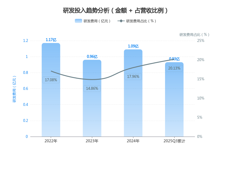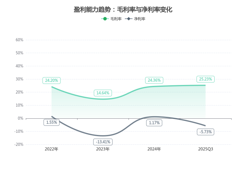 2022-2024年,公司营收复合增长率(CAGR)约-6.1%,2025年Q3累计营收同比微增1.5%,显示营收下滑态势逐步缓解;资产负债率始终维持在30%以下,2025年Q3为21%,远低于行业平均水平,体现了公司极强的财务稳健性。