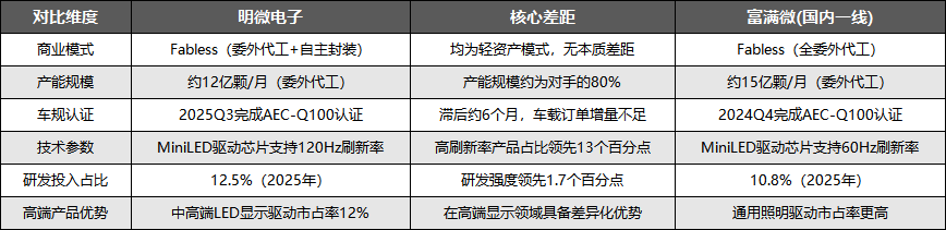 国内市场则呈现分层竞争态势,一线厂商(如富满微等)引领行业发展,二线厂商(如明微电子等)快速跟进。一线厂商在产能规模、车规认证进度上具备优势;明微电子则依托Fabless模式的灵活性和技术积累,在高刷新率MiniLED驱动芯片领域具备明显的差异化优势,但在多方面与一线厂商存在差距,具体对比如下: