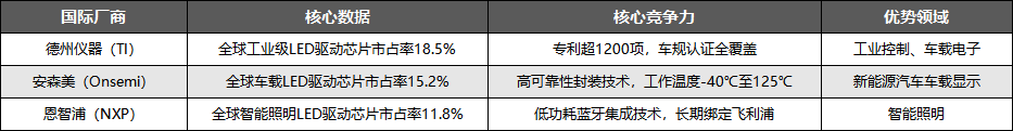 竞争格局方面,当前全球LED驱动芯片市场呈现“国际寡头垄断,国内分层竞争”的格局。国际市场上,德州仪器、安森美、恩智浦等国际巨头占据了全球高端LED驱动芯片市场45%以上的份额,其核心优势如下表所示: