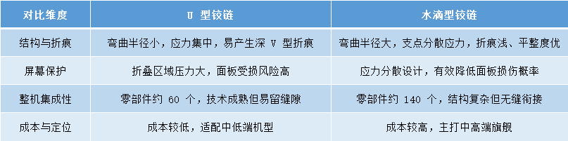 历经数年探索,行业技术路线已经收敛。早期常见的U型铰链虽结构简单,但弯折半径小,折痕明显,已逐渐被淘汰。如今,水滴型铰链已成为无可争议的主流选择。其原理是让屏幕在铰链内部形成类似水滴的大弧度弯折,从而大幅降低应力,实现更浅的折痕和更紧密的贴合。三星自2023年起全系转向水滴铰链,华为、OPPO、vivo等国产旗舰在2025年均已100%采用。据悉,为攻克折痕难题,苹果也深度研究并采纳了类似OPPO Find N5的精密水滴铰链方案。