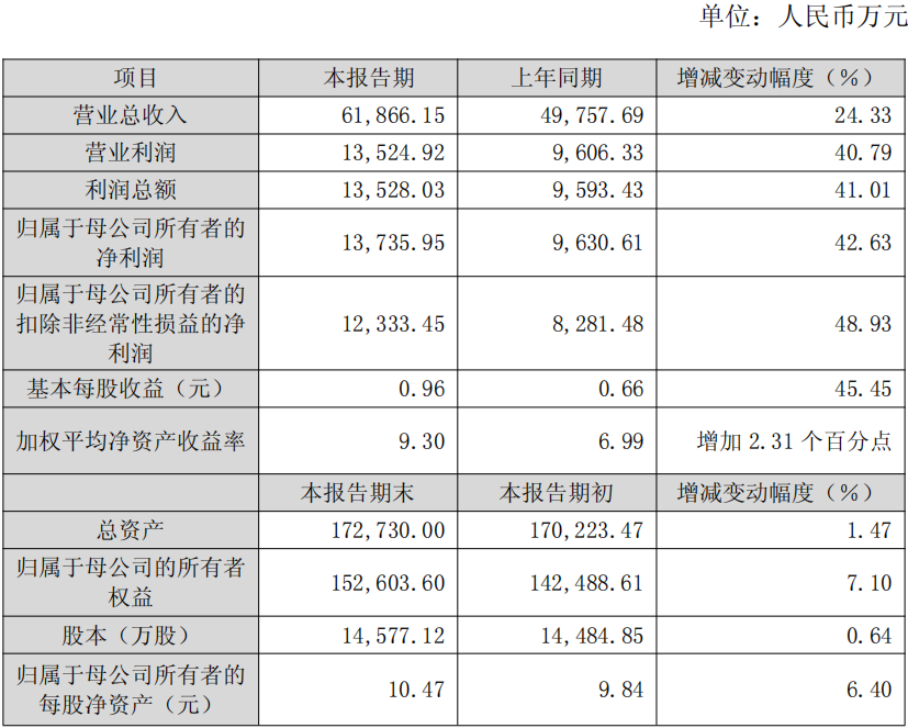 归属于母公司所有者的净利润达到13,735.95万元,较上年同期的9,630.61万元增长42.63%;归属于母公司所有者的扣除非经常性损益的净利润为12,333.45万元,同比增长48.93%。基本每股收益为0.96元,同比增长45.45%。